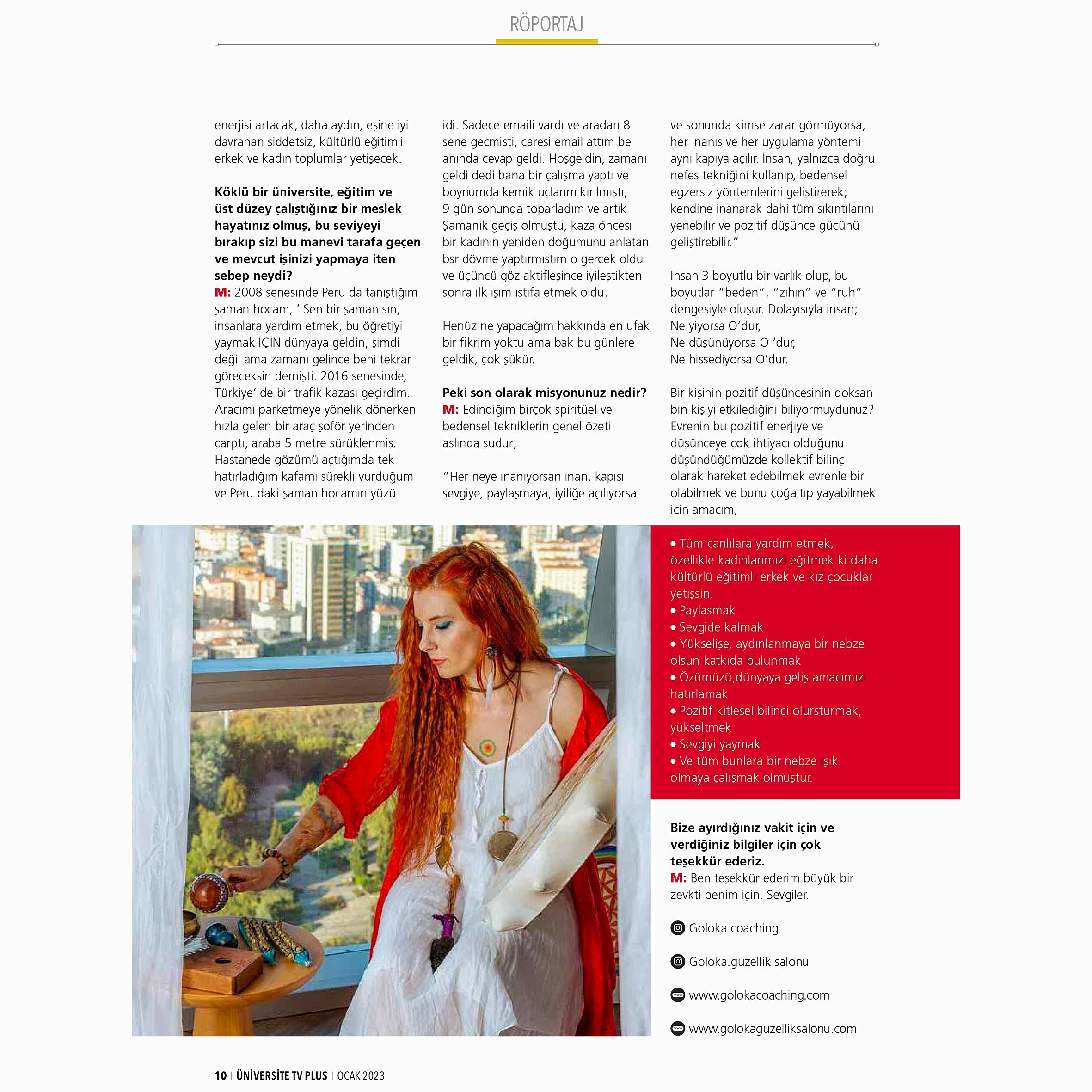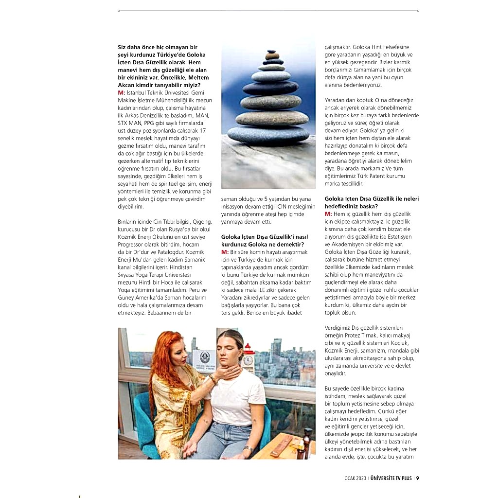 Hem iç güzellik hem dış güzellik için ekipçe çalışmaktayız. İç güzellik kısmına daha çok kendim bizzat ele alıyorum dış güzellikte ise Estetisyen ve Akademisyen bir ekibimiz var. Goloka İçten Dışa Güzelliği kurarak, çalışarak bütüne hizmet etmeyi özellikle ülkemizde kadınların meslek sahibi olup hem maneviyatını da güçlendirmeyi ele alarak daha donanımlı eğitimli güzel ruhlu çocuklar yetiştirmesi amacıyla böyle bir merkez kurdum ki, ülkemiz daha aydın bir topluk olsun. Verdiğimiz Dış güzellik sistemleri örneğin Protez Tırnak, kalıcı makyaj gibi ve iç güzellik sistemleri Koçluk, Kozmik Enerji, şamanizm , mandala gibi uluslararası akreditasyona sahip olup, aynı zamanda üniversite ve e-devlet onaylıdır. Bu sayede özellikle birçok kadına istihdam, meslek sağlayarak güzel bir toplum yetişmesine sebep olmaya çalışmayı hedefledim. Çünkü eğer kadın kendini yetiştirirse, güzel ve eğitimli gençler yetişeceği için, ülkemizde jeopolitik konumu sebebiyle ülkeyi yönetebilmek adına bastırılan kadının dişil enerjisi yükselecek, ve her alanda evde, işte, çocukta bu yaratım enerjisi artacak, daha aydın, eşine iyi davranan şiddetsiz, kültürlü eğitimli erkek ve kadın toplumlar yetişecek.